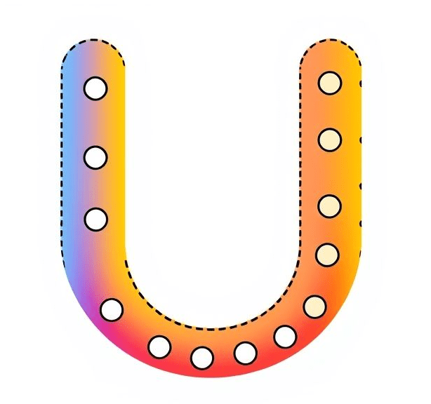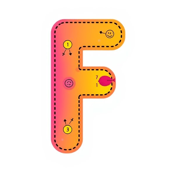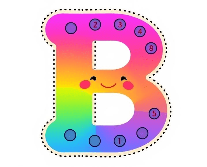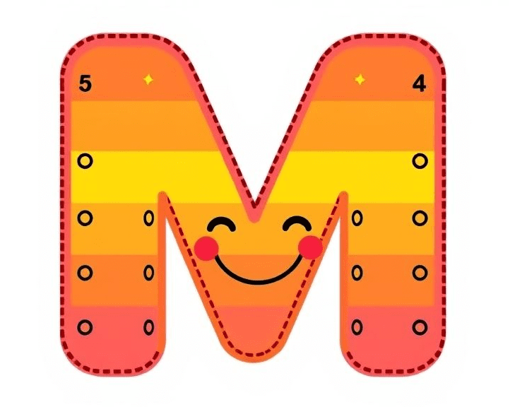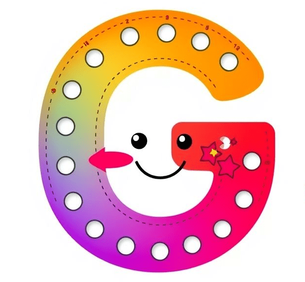 A criança recebe cartões com letras grandes (maiúsculas e/ou minúsculas), contornadas por bolinhas que funcionam como marcações para passagem de barbante, lã ou cadarço. A cada bolinha, a criança deve passar a linha, seguindo a sequência numérica indicada (1, 2, 3…), até contornar toda a letra.